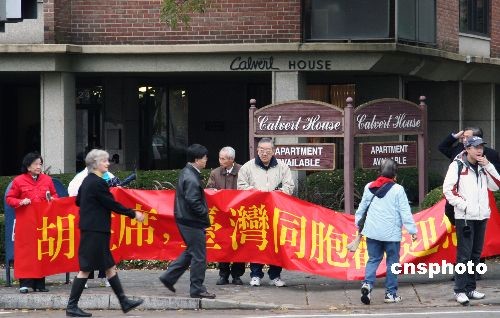 來(lái)自大華府地區(qū)數(shù)千名當(dāng)?shù)厝A僑華人和中國(guó)留學(xué)生,11月14日手拉橫幅準(zhǔn)備迎接參加20國(guó)集團(tuán)金融峰會(huì)的中國(guó)國(guó)家主席胡錦濤。