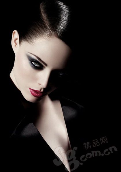 一面是陽剛,一面是陰柔——穿著女士西服,擁有精致的膚色。深邃的具有金屬及煙熏的眼部妝容,鮮粉紅色的嘴唇,充滿了魅惑的吸引。