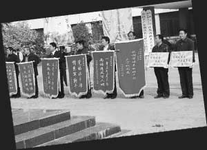 百姓自發(fā)送書記,錦旗、萬民傘、清官旗齊了