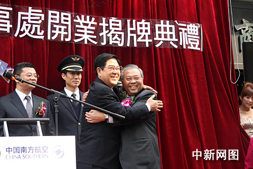 1月15日,大陸南方航空公司在臺北正式成立辦事處,成為首家在臺灣掛牌運營的大陸企業(yè)。圖為開業(yè)揭幕儀式典禮上,南航董事長司獻(xiàn)民(左一)與臺灣華航董事長魏幸雄熱情擁抱。中新社記者 陳立宇 攝