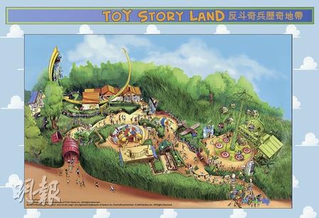 以電影《反斗奇兵3》為骨干,在區(qū)內(nèi)擺放各式超巨型玩具,旅客置身其中,如變了小矮人。區(qū)內(nèi)有3個機動游戲:其一是賓客坐上如“臘腸狗”的設(shè)施,經(jīng)歷一段顛簸旅程;另一設(shè)施是一臺穿梭飛車,接載賓客沿高達數(shù)十呎的U形軌道快速來回;最后是一個“跳傘”訓(xùn)練旅程,賓客可因應(yīng)喜好,調(diào)校從25米高臺向下急墜的速度。