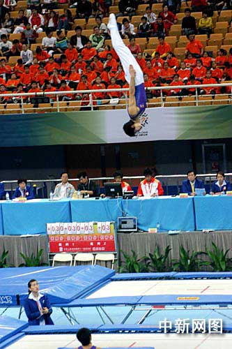 中新網(wǎng)濟南10月12日電 (記者 胡洪林 張譯文 王超) 中國第十一屆運動會蹦床比賽今天在山東省城濟南奧體中心開賽,來自山東、天津、福建、山西等省的13支代表隊、160名運動員將在此爭奪4枚金牌。本屆運動會蹦床比賽分男女團體和男女網(wǎng)上個人4項比賽,團體賽由3名網(wǎng)上運動員和1名單跳運動員組成,獲得團體預(yù)賽前8名的隊伍參加決賽。