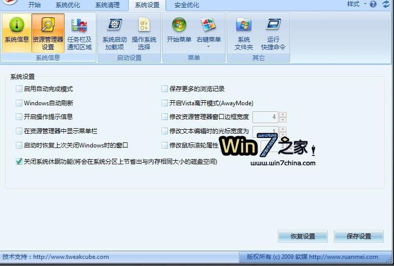 此外,從Vista時(shí)代,由于睡眠功能的存在,休眠功能其實(shí)已經(jīng)趨向于可有可無(wú)了,同時(shí),禁用休眠功能還可以節(jié)省出于內(nèi)存同等大小的硬盤(pán)空間,因此,我們建議大家使用Windows 7優(yōu)化大師 (點(diǎn)此下載) 或魔方 (點(diǎn)此下載)中的系統(tǒng)設(shè)置關(guān)閉休眠功能。