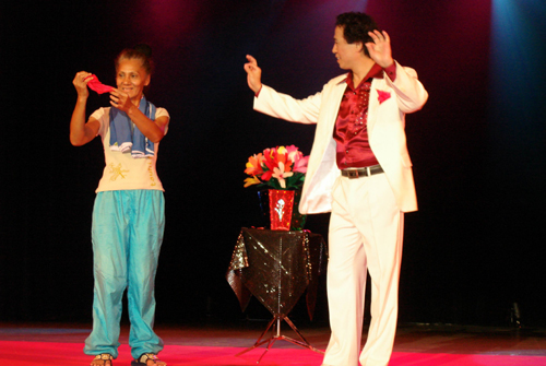 演出從活潑、歡快的空竹表演開始。藝術小組小演員們嫻熟地抖動、拋起空竹的動作,使現(xiàn)場不時爆發(fā)出熱烈的掌聲和歡呼聲。魔術演員敏捷的變幻手法則讓學生們睜大了好奇的眼睛。接下來的鉆桶、轉盤子節(jié)目,小演員們以風趣幽默的表演和頂上、手上技巧表現(xiàn)出熱鬧的生活場景,引來學生們陣陣歡笑。柔術則以柔美的肢體語言和行云流水般的輕盈舞姿,獲得觀眾不停的贊嘆聲。壓軸的川劇變臉、吐火表演又讓觀眾領略了中國傳統(tǒng)戲曲藝術的獨特魅力。