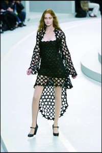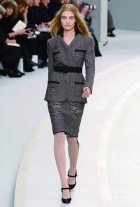 2008年Chanel的秋冬時裝秀場上,卡爾·拉格斐在秉承Coco Chanel“貧窮的奢華”的原則下,刻意給斜紋軟呢外套加上了抽線設(shè)計,拼接的碎布在手肘、口袋與短裙上隨處可見。不收邊的剪裁效果,充滿搖滾興味,戲劇化的荷葉邊、充滿立體感的打褶剪裁與布料上的紋路,成為Chanel本季的設(shè)計主軸。