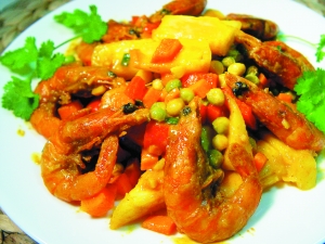 咖喱菠蘿蝦是一道泰式風(fēng)情料理,是選用新鮮菠蘿肉和大蝦,與泰國黃咖哩和清水一同烹煮,加入椰漿調(diào)味即成。迪雅稱,大蝦炸后不僅酥脆彈牙,還飽吸了香濃的咖哩汁,吃完后用清甜的菠蘿肉和咖哩汁來撈白飯,保證讓你一吃就停不了口!
