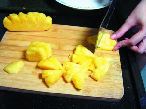 1 菠蘿去皮和眼洗凈,果肉切成塊狀;紅蘿卜、紅椒切成;青豆放入沸水中焯一下,撈起過冷河。