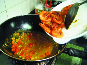 5 加入1/4湯匙白糖和1/3湯匙雞粉調(diào)味,倒入紅椒丁和炸好的對(duì)蝦翻炒均勻。