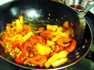 6 注入1/3杯椰漿,倒入菠蘿塊拌炒均勻,即可上碟。