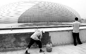 游人用手機(jī)拍攝建設(shè)中的國家大劇院。