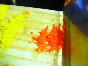 2 黃彩椒去蒂和籽,切成細末;紅蘿卜去皮,也切成細末;蔥去頭尾,切成蔥末。