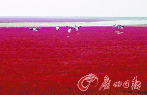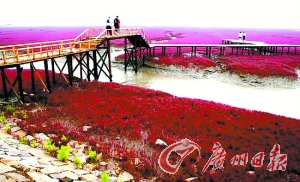 在美麗、富饒的遼河三角洲的海岸灘涂上,延綿百里、大片地生長(zhǎng)著一種生命力頑強(qiáng)的潮間帶植物堿蓬草。堿蓬草每年四五月間長(zhǎng)出地面,初為綠色,由于受海水的浸泡,太陽光照射下漸由綠變紅,9月至11月,呈紫紅色。秋風(fēng)吹拂下,紫紅色的堿蓬草涌起重重的波浪,“紅海灘”因此得名。