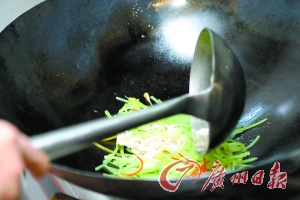 5. 油熱后爆一下彩椒,然后加入萵筍絲和生魚絲爆炒,然后用生粉兌水勾芡即可起鍋。