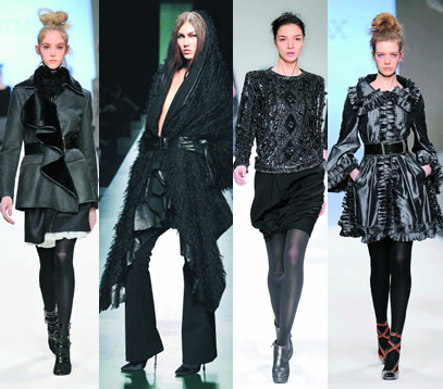 1.在色彩都選用黑白色系的同時,服裝面料的多元化搭配成為取勝關(guān)鍵,以不同色度、材質(zhì)的黑色呈現(xiàn)出質(zhì)感與光效的微妙對比,比如絲與閃光的亮片,法蘭絨和色丁,天鵝絨與閃光提花的對比效果。
