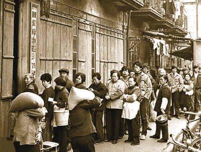 1982年,一個(gè)寒冷的冬天,人們?cè)谏虾J兄行牡膰?guó)營(yíng)南市區(qū)第72號(hào)糧店門口排隊(duì)買米。排隊(duì)的人們把凍僵的雙手塞進(jìn)口袋里或縮到袖子里。隊(duì)伍很長(zhǎng)。王文瀾攝