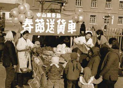 20世紀(jì)60-70年代商品短缺時(shí)期,年貨也需憑證配給。圖為黑龍江省哈爾濱市中山服務(wù)站的送貨車將年貨送到居民大院。來(lái)源:人民網(wǎng)