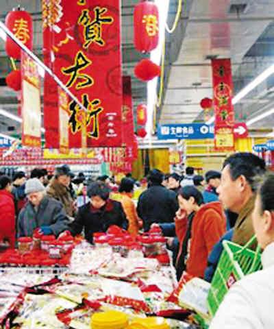 2002年春節(jié)前夕,南京中央金城倉(cāng)儲(chǔ)超市別出心裁,在店內(nèi)辦起了“年貨大街”,市民可以在此將各種傳統(tǒng)年貨一站購(gòu)齊,既經(jīng)濟(jì)又方便。來(lái)源:人民網(wǎng)