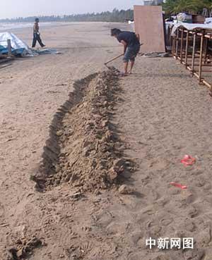 (漲潮使得海上煙花舞臺(tái)淹沒(méi)了將近三分之一,現(xiàn)場(chǎng)工作人員決定建造一個(gè)防水圍堰以保證舞臺(tái)安全,圖為圍堰施工中。)