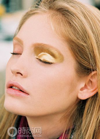 在金色眼影上畫一條粗細(xì)適當(dāng)?shù)难劬,畫眼線時(shí)不妨將臉部的角度調(diào)整得低一點(diǎn),可以讓眼尾有自然的幅度。在黑眼球的上方,輕輕地重復(fù)加強(qiáng)描繪,由眼角往眼尾方向慢慢加粗,然后用棉花棒將描繪過(guò)的眼線暈開(kāi),可以讓眼線線條變得柔和、立體。