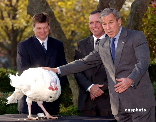 美國(guó)一年一度的感恩節(jié),美國(guó)總統(tǒng)布什特別依照慣例,在白宮赦免了2只火雞,溫馨又有趣。去年總共有2只火雞得到總統(tǒng)的免死金牌,分別叫“May”和“Flower”,也就是07年清教徒來(lái)到新大陸所搭乘的“五月花號(hào)”的意思。
