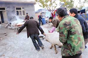 映秀鎮(zhèn)活動板房的居民忙著熬豬油,百公里外的汶川蘿卜寨,村民們正忙著殺年豬呢。昨天早上9點,記者剛走進村子,就聽到豬的嚎叫,五個年輕的男子有的逮豬耳朵,有的揪豬皮,還有個抓尾巴,使出全身力氣,想讓豬乖乖就范,可那頭豬很有點莽勁,哇哇慘叫著直往外奔,“按。“醋!”豬主人袁慶彬拿著一把長刀跟著攆,還一邊指揮大家用力把豬按在長板凳上,五個人使出全身力氣按住,袁慶彬瞅準(zhǔn)時機對準(zhǔn)豬的喉嚨,一刀下去,一會兒血就流滿了一大盆。此時氣溫接近0℃,可他的背心居然浸出了汗,拿了一張干毛巾使勁擦。