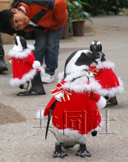 身穿圣誕服裝的企鵝再公園中翩翩行走。8日攝于松江市。(共同社)