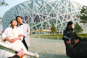 昨日,鳥巢外,來自牙買加的游客戴文被這對新人吸引,在聽志愿者簡單講述了兩人在地震中的遭遇后,他伸出手握住了賀晨曦和鄭廣明,并希望與他們合影。
