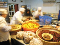 昨晚7時(shí),記者來(lái)到廣化寺時(shí),廚房里十多位義工已經(jīng)忙得不可開交。據(jù)一位義工介紹,兩天前他們就開始為熬臘八粥做準(zhǔn)備,挑米、挑豆子,清洗原材料,一直忙到昨天下午,才將上千斤原料拾掇干凈。