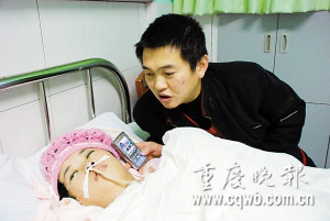 “小豬兒,來,聽聽歌曲。”昨日上午11時,巴南區(qū)人民醫(yī)院神經(jīng)外科病房,42歲的趙江用手機播放著“你問我愛你有多深”。病床上,女友朱永萍眼睛似閉非閉,毫無反應(yīng)。