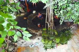 溫泉養(yǎng)生區(qū)的山石、樹根、藤蔓營造出熱帶雨林的幽雅環(huán)境,其中不乏藥池以及石質(zhì)的按摩床,同時(shí),還引入了死海漂浮、親親魚療等自費(fèi)項(xiàng)目。泡乏了,可以到二樓享受按摩、足療等服務(wù)。