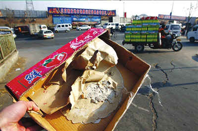 昨天下午,記者見到了這種紙箱。在箱子底部,貼有一張黃色草紙,摸起來凹凸不平。拿刀子割開草紙發(fā)現(xiàn),紙箱底部沾著一層“膩?zhàn)语灐,直徑約一尺,厚約3毫米,尚未完全干透。記者從市場(chǎng)內(nèi)找了一臺(tái)電子秤測(cè)量,這個(gè)特殊的箱子質(zhì)量有2斤1兩,而與之相同的一般紙箱不到一斤。
