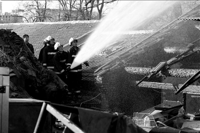 消防隊員在火場附近房頂上噴水滅火。本報記者夏永攝