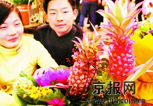 一種鳳梨科粉色菠蘿花熱銷京城各大花卉批發(fā)市場。這種粉菠蘿花期有3個月,單株價格在25元左右。據(jù)一攤主介紹,最近有不少年輕人預(yù)訂此花作為情人節(jié)禮物。