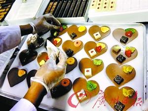 美國(guó)一家店鋪里為情人節(jié)擺出“心”形蛋糕。