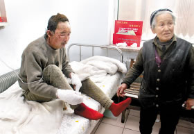 昨日,記者來到長春燒傷醫(yī)院,見到了母子兩人。42歲的崔某頭部、面部、雙手等處被燒傷,雙手纏著厚厚的紗布。崔某83歲的母親一直在病房內(nèi)照顧兒子。