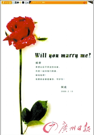 “婉君,Will you marry me?希望以后不用送你回家,而是一起回我們的家?——阿成”,為了趕在情人節(jié)前送女友一個難忘的感動,昨日,三水一位署名“阿成”的市民在本報三水金版上刊登整版求婚廣告,引起全城關(guān)注,求婚宣言讓許多市民大嘆“浪漫”,也好奇求婚記是否完美收場?記者找到了求婚者阿成和女主角婉君,還原甜蜜回憶。
