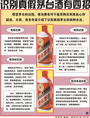 據(jù)她介紹,茅臺酒廠目前在北京專設了多名打假人員,通過明察暗訪的方式,尋訪假酒的線索。一旦發(fā)現(xiàn)假酒,將舉報工商部門或以法院起訴的方式“打假”。她說,目前打假人員還是主要針對高檔餐廳、酒店和超市進行打假。對一些小的煙酒店所賣的假茅臺酒,他們暫不作為“打假”重點。莫律師承認,目前在市場上存在著大量假茅臺酒,但針對“出了貴州,就喝不到真的茅臺”和“茅臺酒中80%是假酒”的傳言,她表示假酒并無傳言中的那樣多。