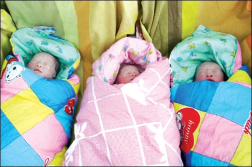 由于家里經(jīng)濟困難,這次直到懷孕5個月時,童芳才在丈夫的陪同下到醫(yī)院做B超檢查,發(fā)現(xiàn)懷的竟是三胞胎!爱敃r我又開心又擔心,開心的是竟然一次懷了三個,擔心的是怕三個全是女兒!蓖继寡浴