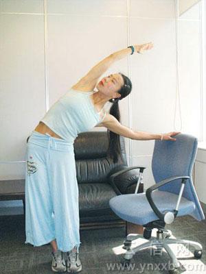 動作要領(lǐng):挺身直立,雙腳并攏,左手放在椅背上,右手高舉過頭頂,貼緊耳側(cè)。吸氣脊柱向上延伸,呼氣上身從腰部彎曲,傾向左側(cè),彎曲到最大限度,想象自己是一棵隨風(fēng)搖擺的樹。保持10-20秒鐘,換方向重復(fù)動作。