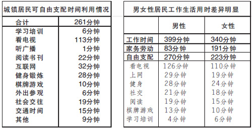 近期美國(guó)、日本等9個(gè)發(fā)達(dá)國(guó)家調(diào)查數(shù)據(jù)表明,男性平均可以自由支配時(shí)間為5小時(shí)6分鐘,女性為4小時(shí)43分鐘,分別高于北京市居民46分鐘和60分鐘。