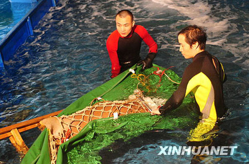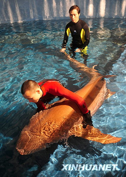 當(dāng)日晚,廣東省漁政部門從廣州一家酒樓解救出一條護(hù)士鯊,并將其送到廣東省水生野生動(dòng)物救護(hù)基地。據(jù)悉,此護(hù)士鯊為廣州某酒樓從水產(chǎn)市場(chǎng)購(gòu)得,在酒樓水族箱里展示,接受食客們的預(yù)定。環(huán)保人士獲知后前往酒樓抗議護(hù)鯊,漁政部門隨即前往酒樓將其救出。護(hù)士鯊屬于廣東省野生保護(hù)動(dòng)物,受到廣東地方保護(hù)法保護(hù)。新華社記者 盧漢欣 攝