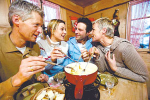 除了“奶酪火鍋”、“布吉尼奧納火鍋”外,瑞士常見的還有“巧克力火鍋”。這種火鍋是將巧克力搗成小塊,再放入少量淡奶油、甜酒(橘子酒、櫻桃酒)后用溫火慢慢攪拌并煮化巧克力,再放入諸如草莓、蘋果、香蕉、菠蘿等能切成塊的水果;吃時(shí)用長(zhǎng)柄叉子叉著水果片,蘸著鍋中的巧克力汁一片一片地吃。覆蓋在水果表面的巧克力凝固后變得清脆爽口,甜甜蜜蜜,特別像北京冬天吃的糖葫蘆。冬天吃巧克力火鍋,可以抵御寒冷,又有浪漫情趣,因此最受青年戀人們的喜愛。