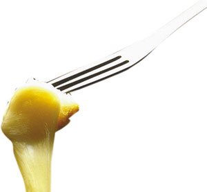 “奶酪火鍋”是瑞士最普遍、最具盛名的火鍋之一。瑞士人制作“奶酪火鍋”一般都是先以蒜涂抹于鍋底,再將不同口味的硬奶酪擦成碎末放入鍋中加熱成糊狀,再加淀粉、白葡萄酒、大蒜、奶油等,繼續(xù)煮并慢慢攪拌至完全融化呈濃濃的煉乳狀,最后放進(jìn)一些黑胡椒即可。上桌后,人們用長(zhǎng)柄叉子叉著切成四五厘米見方的“法式長(zhǎng)棍面包”蘸著奶酪吃,很像中國(guó)的“拔絲香蕉”。此外,吃這種火鍋時(shí),瑞士人還特別喜歡配上有助于清口的風(fēng)干牛肉、腌酸黃瓜、小洋蔥。不過,吃這種火鍋一定要“點(diǎn)到為止”,雖然奶酪富于營(yíng)養(yǎng),但很難消化,用白葡萄酒融化奶酪,就是為了幫助消化!