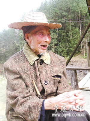 唱歌的老者坐在院壩前,滿頭白發(fā),滿臉皺紋,手拿一根近1米長(zhǎng)的煙桿,煙已熄,他沒(méi)發(fā)現(xiàn)。