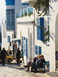 有一幢房屋,綠色的樹和紅色的花緊貼著白墻生長,只露出藍(lán)色的門窗。我恍惚起來,這不是童話里最迷人的場景嗎?在這樣的場景里,藍(lán)色的門被推開,走出了童話里的阿拉伯公主,她回眸一笑,然后沿著鵝卵石小街邊的臺階,一步步地走下去,走到一望無際的地中海邊。我也沿著臺階走下幾步,那里是一個露天咖啡館,坐在木質(zhì)長椅上,點一杯突尼斯人最愛喝的薄荷茶,倚著欄桿,面朝大海,不知不覺間人便沉靜了下來,漸漸地好像融化在純凈的藍(lán)色與白色里。