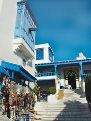 站在小鎮(zhèn)的最高處,才會(huì)發(fā)現(xiàn)其實(shí)這里地勢險(xiǎn)要,真是臨海的峭壁。可正是因?yàn)榍逡簧乃{(lán)色和白色,消解了所有的陡峭,將一切平和地鋪展開來。聽說這里的房屋之所以選擇白色,主要是出于生活上的考慮,因?yàn)榈刂泻Q匕兜南奶鞖夂蜓谉幔咨哂胁晃鼰嵊秩菀咨岬奶匦,因此涂在房屋外墻,可保持室?nèi)涼爽,再加上這里盛產(chǎn)石灰,于是選擇白色也就理所當(dāng)然了。一位突尼斯朋友開玩笑說,在這里只消賣藍(lán)色油漆和白色石灰,就能讓生活過得自由自在。事實(shí)上,如此讓人驚艷的藍(lán)與白的搭配,在地中海沿岸的其他地方并不鮮見,只是突尼斯人對生活的熱愛,對人的天性的格外尊崇,才使得西迪布賽這座“藍(lán)白小鎮(zhèn)”成為世上一個(gè)獨(dú)特的存在。