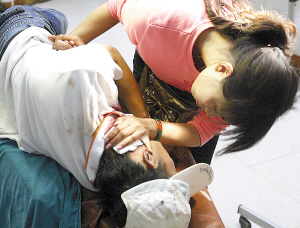 昨日下午3點(diǎn)多鐘,脖子血流不止的周方被救護(hù)車送進(jìn)市急救中心后拒絕進(jìn)入急診室接受治療。記者看到,周方的脖子左側(cè)有一道長約6公分的刀傷,鮮血直流,染紅了白色T恤和頭上的棒球帽。醫(yī)護(hù)人員和匡非好不容易將他勸進(jìn)去,他卻趴在病床上痛哭不已,約10分鐘后,才平靜下來,接受了縫合處理。據(jù)醫(yī)生介紹,周方的傷口淺,未傷及主動(dòng)脈,無生命危險(xiǎn)。