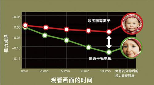 觀看100分鐘期間視力變化測(cè)試表明:長(zhǎng)虹歐寶麗的舒適度更高,觀看期間視力下降更少,休息后視力水平更佳。(參見(jiàn)下圖)
