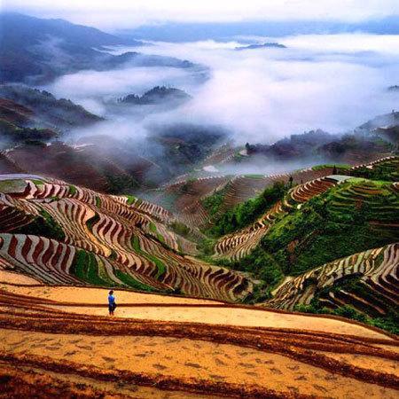 梯田的規(guī)模磅礴壯觀、氣勢恢宏,線條行云流水、瀟灑流暢,為天下梯田所望塵莫及;雖說南國山區(qū)處處有梯田,可是像龍脊梯田這樣大規(guī)模的集中實屬罕見。從流水湍急的河谷,到白云繚繞的山巔,從萬木蔥蘢的林邊到石壁陡崖前,凡有泥土的地方,都開辟了梯田。垂直高度達五六里,橫向伸延五六里,那起伏的、高聳入云的山,蜿蜓的如同一級級登上藍天的天梯,像天與地之間一幅幅巨大的抽象畫……每位看見這一景色的游客,心靈也都會被深深地震撼!這是一種難以言表的,一種被大自然的雄奇以及人的偉力所引起的震撼!