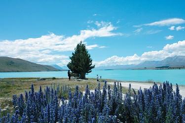 擱下行李我們一直向南而去,尋找皇后鎮(zhèn)南端的人間仙景蒂卡波湖。寂靜的湖面,四周覆蓋著蒼翠的樹木和盛開的魯冰花,加上對岸雪山倒影,四季美景濃縮一簾。缺水的新西蘭島國對湖水的利用可以說是費(fèi)煞苦心,海拔700多米的高山湖泊,筑了7條人工導(dǎo)流明渠,不但用以截流灌溉,而且,還在每一出水口修建了水利發(fā)電廠,7座電廠為南島的畜牧農(nóng)漁提供了豐裕的清潔能源。科研人員還在截流湖中試養(yǎng)原本生活在大海里的“三文魚”。第一次見到在淡水中游弋的“三文魚”,怎不叫人嘴饞!花上10個紐幣,我們吃上了活殺生食的淡水“三文魚”。說實(shí)話,這人工飼養(yǎng)的淡水“三文魚”太肥太油膩,口感和味道遠(yuǎn)差海水“三文魚”一籌,但我還是由衷感到高興,這畢竟是人類由漁到養(yǎng)的轉(zhuǎn)變,“三文魚”將永不枯竭。食罷魚宴,不久,我們的車已駛?cè)肓诵挛魈m著名的南島水果園,紅的櫻桃、粉的水蜜桃、黃的杏子、綠的蛇果,五顏六色的累累碩果,掛得樹條彎下了腰。為了充分利用水資源,每棵樹下均有一條微型水管進(jìn)行滴灌,晝夜較大的溫差,明媚陽光的輻射和沒有污染的潔凈空氣,給水果提供了優(yōu)良的生長環(huán)境,來到了果園,人人現(xiàn)摘現(xiàn)吃。導(dǎo)游見我從樹上摘下櫻桃還要在自己T恤上蹭蹭,便告訴我說,不用蹭,這里的水果很干凈。于是,我扔幾粒入口,原汁原味。